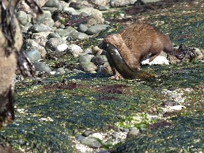 This Mink was running for cover with his/her fresh fish lunch gathered from the pools exposed at low tide. The prey is a Rock blenny (Xiphister mucosus) which lives under rocks in the intertidal and sub-tidal zones.