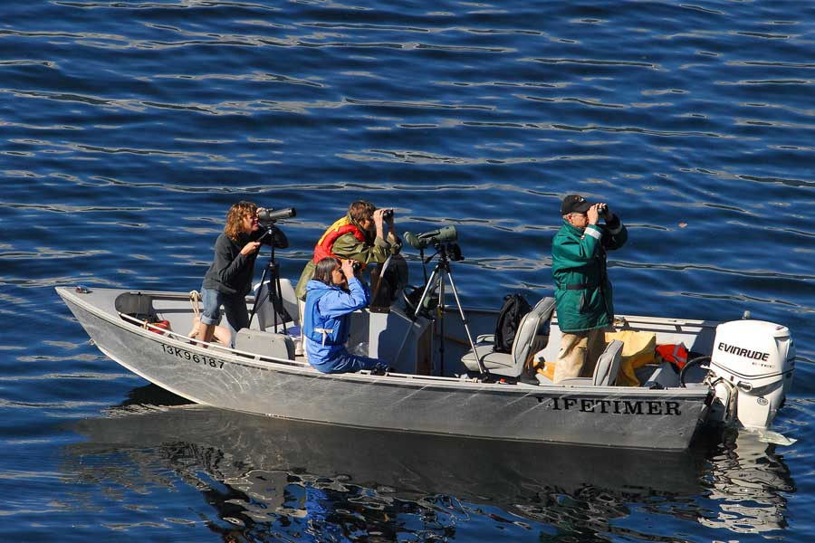 So far, of the 30 nests being monitored, 16 may be actively occupied by juvenile eagles. In July the juveniles start to spend more time standing up near the edge of the nest and thus they are more visible to monitors observing from below. Recently monitoring of shoreline nest-trees was tried from the ocean. Despite very windy weather, 10 nests were examined. The results were very worthwhile. A new nest was identified from the ocean-viewing vantage point. Another nest that was thought to be empty and is very difficult to see from land, was occupied by a juvenile. Overall six juvenile eagles were seen from the ocean. Monitoring will continue through July.